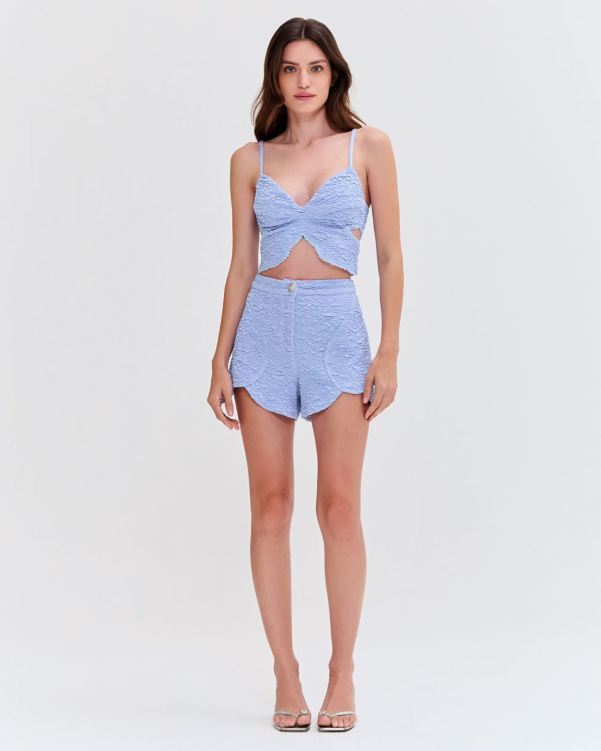 This top is made of stretch jacquard with a full butterfly design bodice for a cropped fit with side cut out details. Exposed back zipper closure.