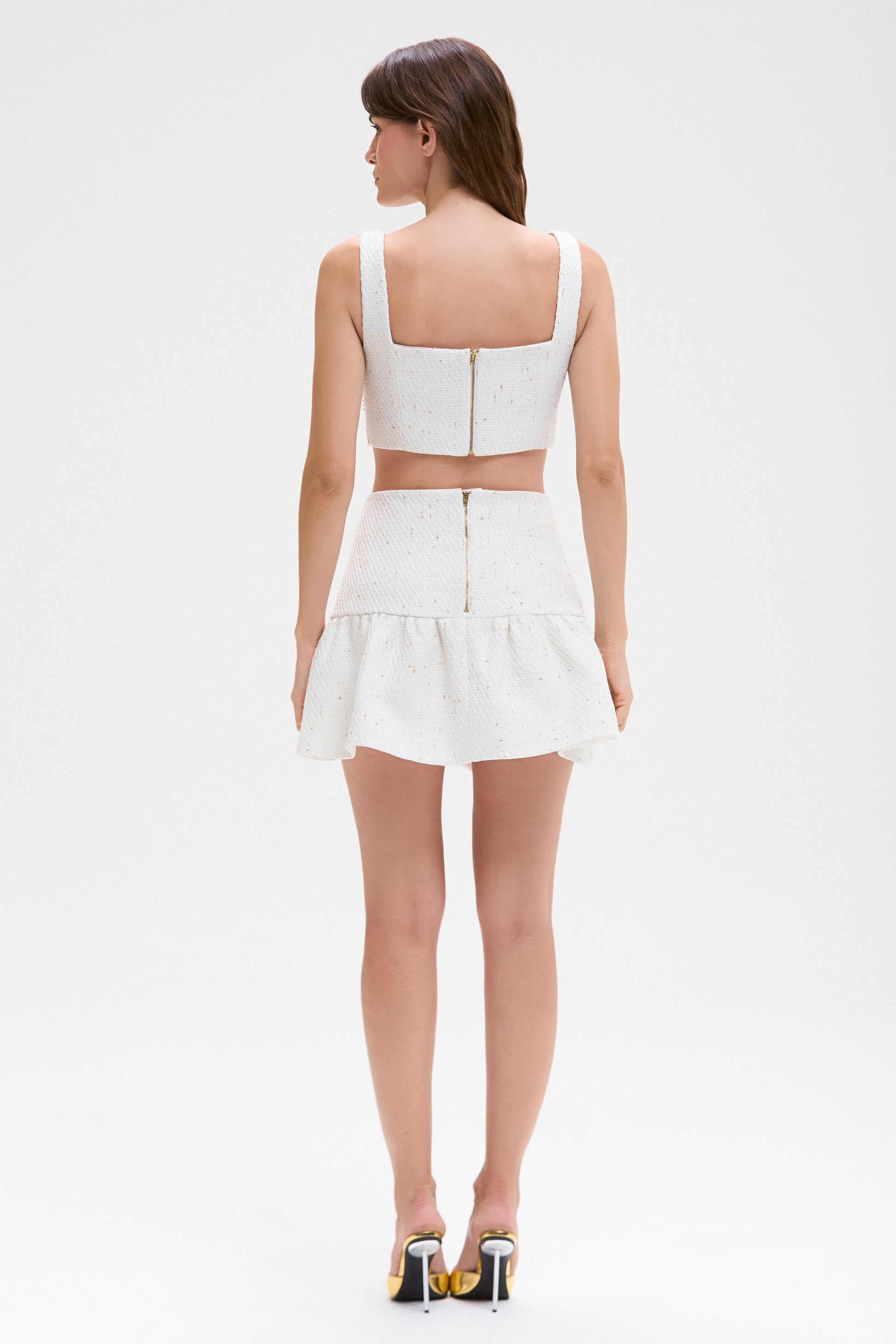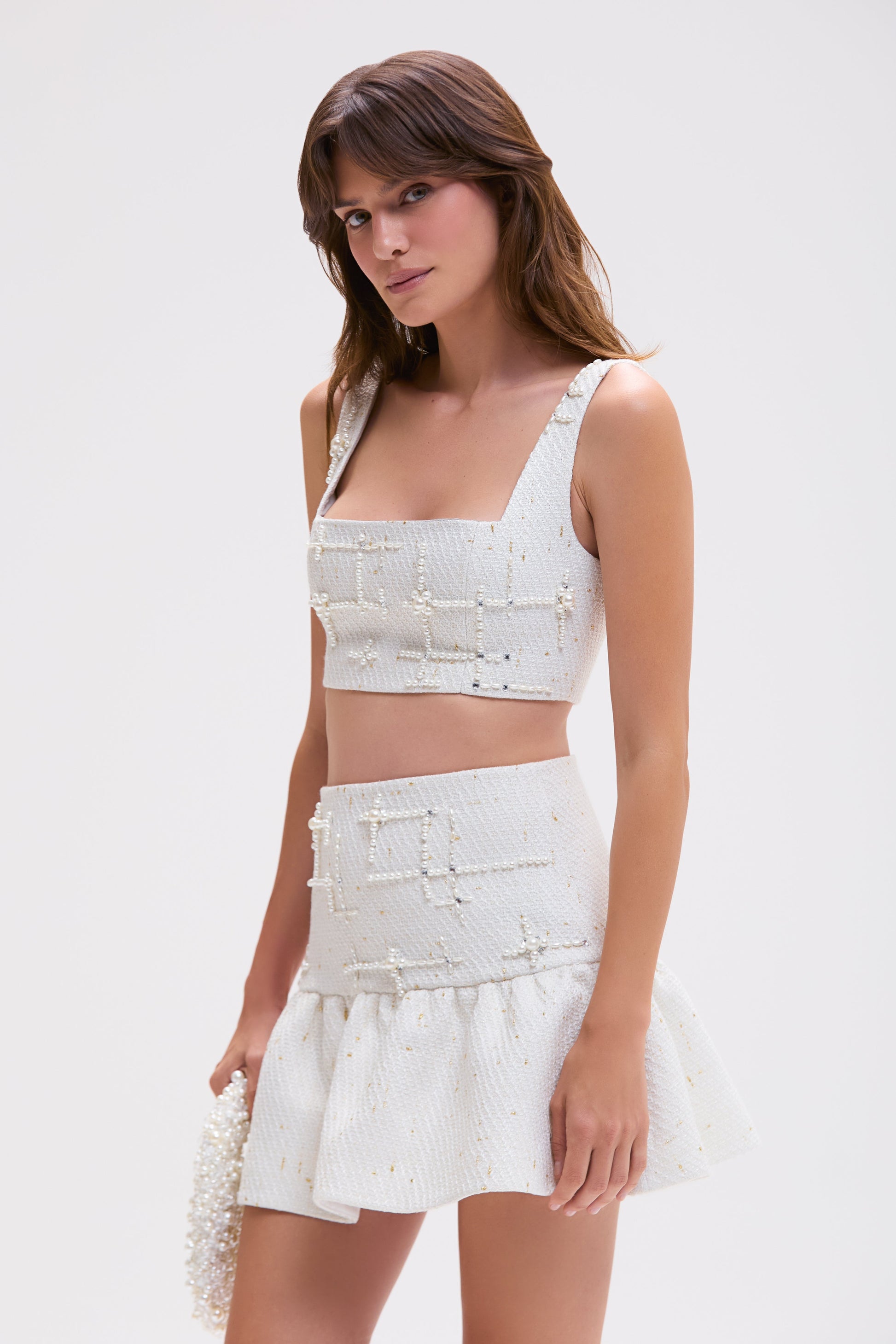 Crafted from tweed woven with subtle golden threads, this cropped top is entirely hand-embroidered with pearls and crystals in an intricate geometric pattern that blends luxury with modern edge. Its structured silhouette enhances the figure, while the cropped length adds a versatile touch, perfect for elegant pairings or contemporary styling.