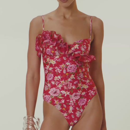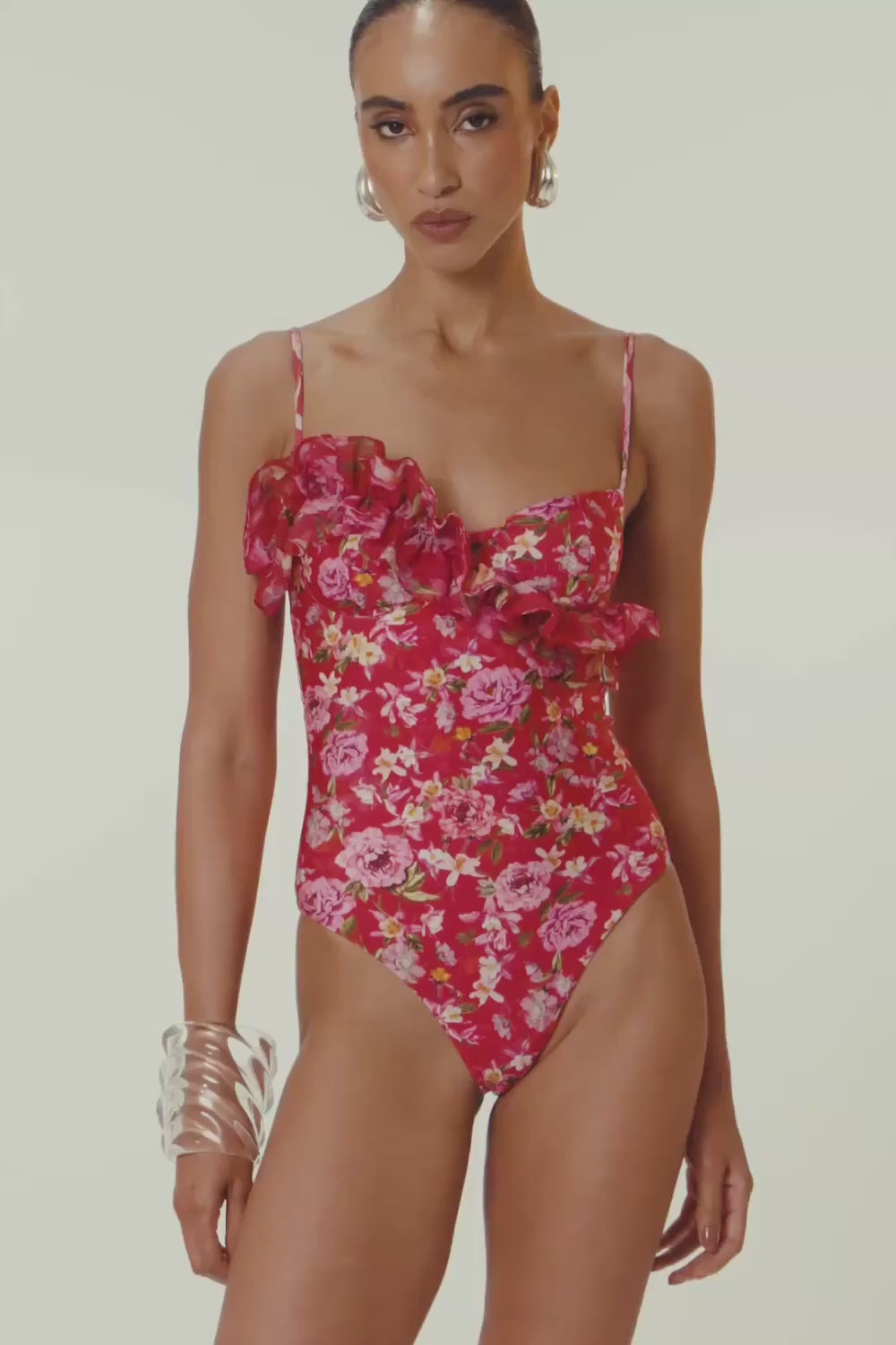 PEONY PRINT LYCRA RUFFLE BODYSUIT