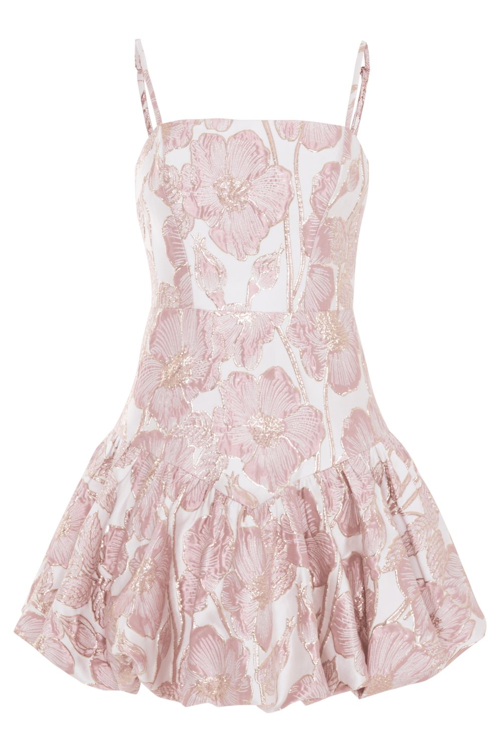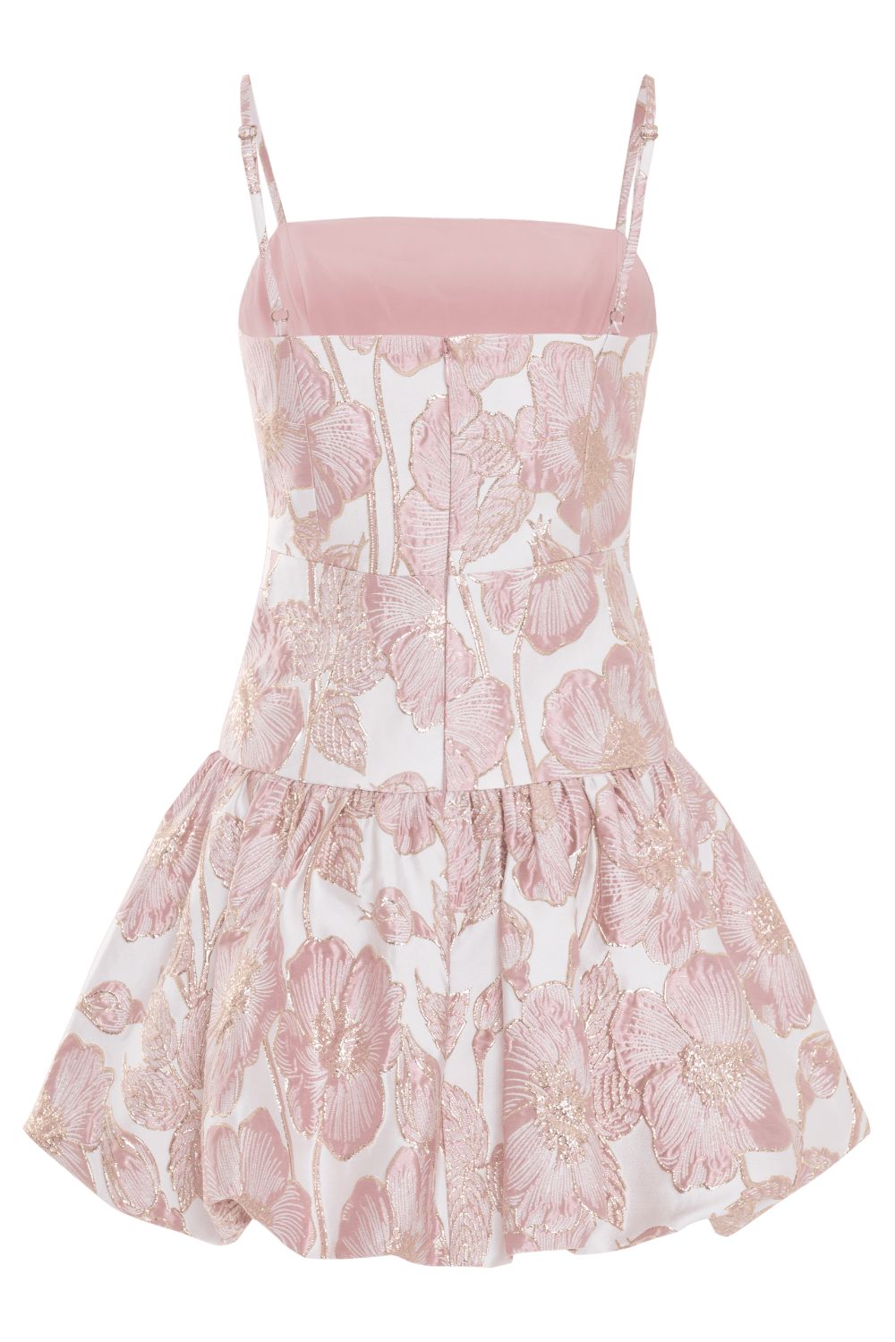 Crafted in our Petal Jacquard fabric, this playful mini dress features a pink floral motif with subtle gold accents and a soft metallic sheen. The silhouette is defined by a V-shaped drop waist and a delicate bubble hem, balanced by thin adjustable straps. Finished with a concealed back zipper closure.