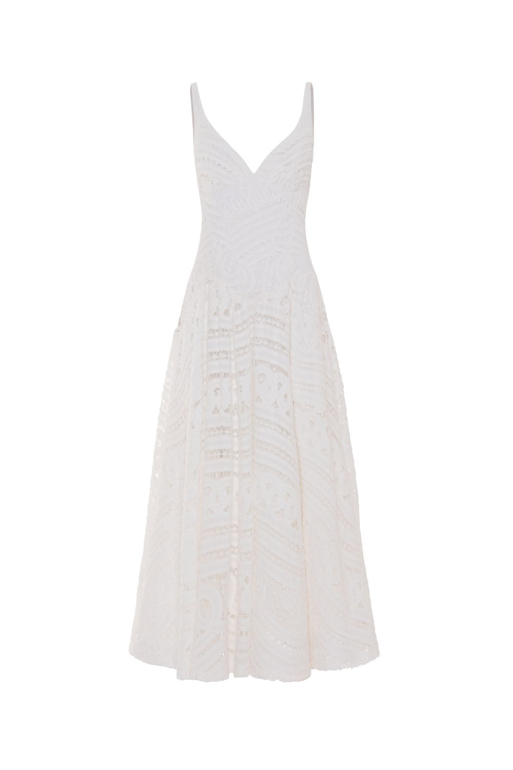 Refined and timeless, this white midi dress features a flattering V-neckline, fitted bodice, and flared skirt with soft movement. Crafted from intricate embroidered fabric in a subtle chevron pattern, it’s perfect for bridal celebrations, garden parties, or any elegant warm-weather occasion.