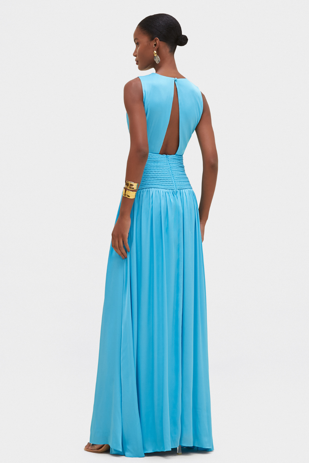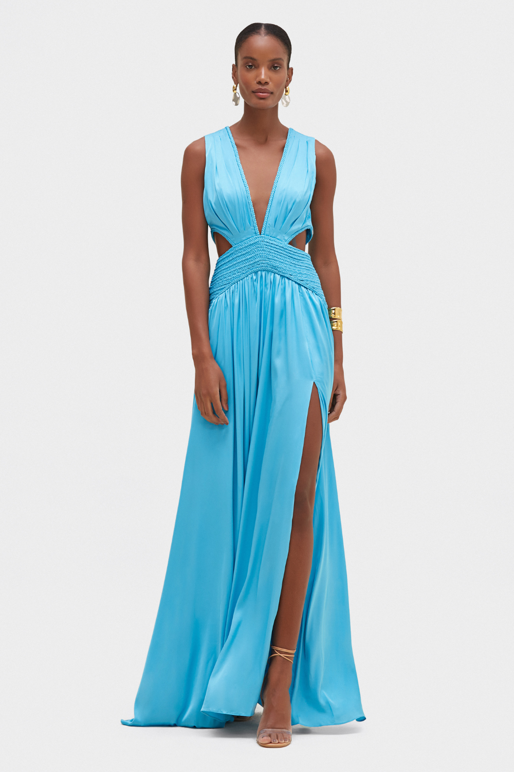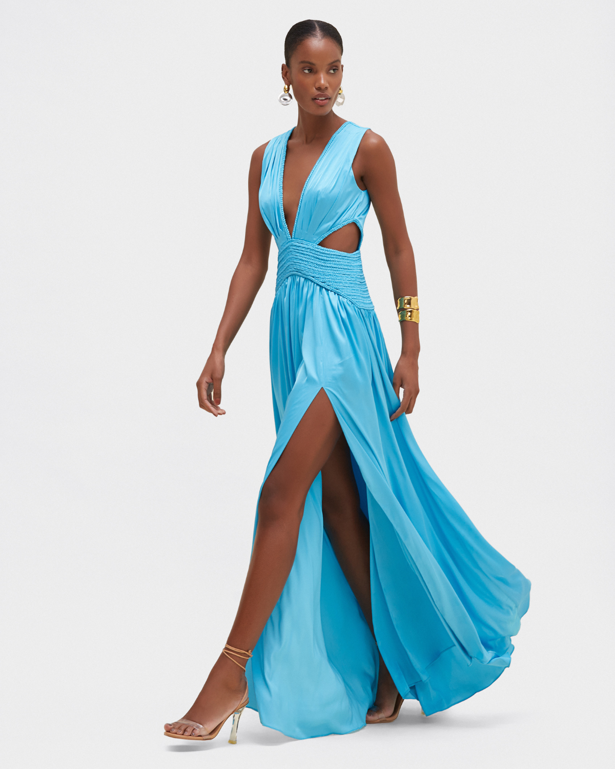 This Satin Sunset Cut Out Gown features a plunging neckline with flattering side cutouts, and handmade braided detailing along the waistline into a flowy skirt with a dramatic side slit.