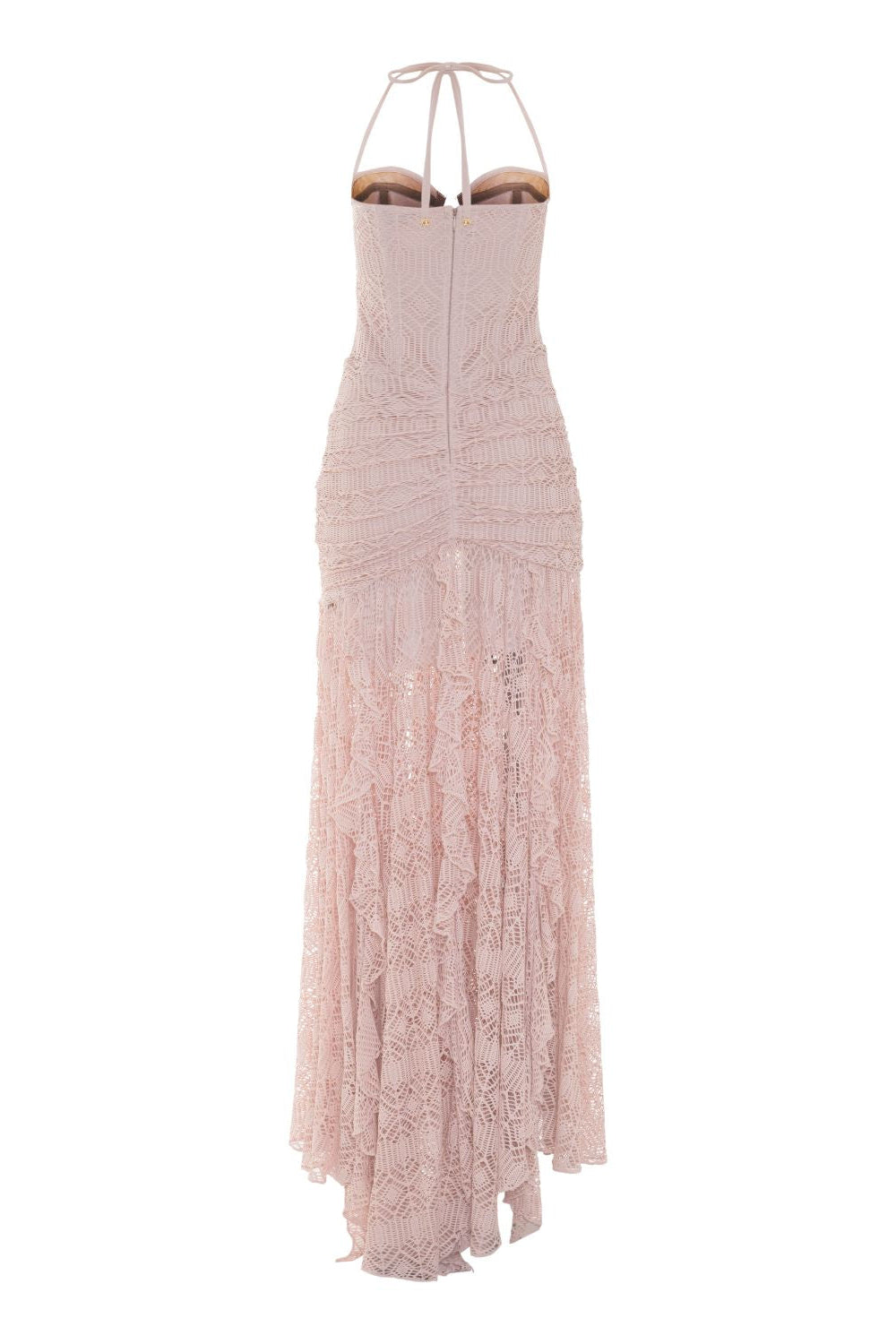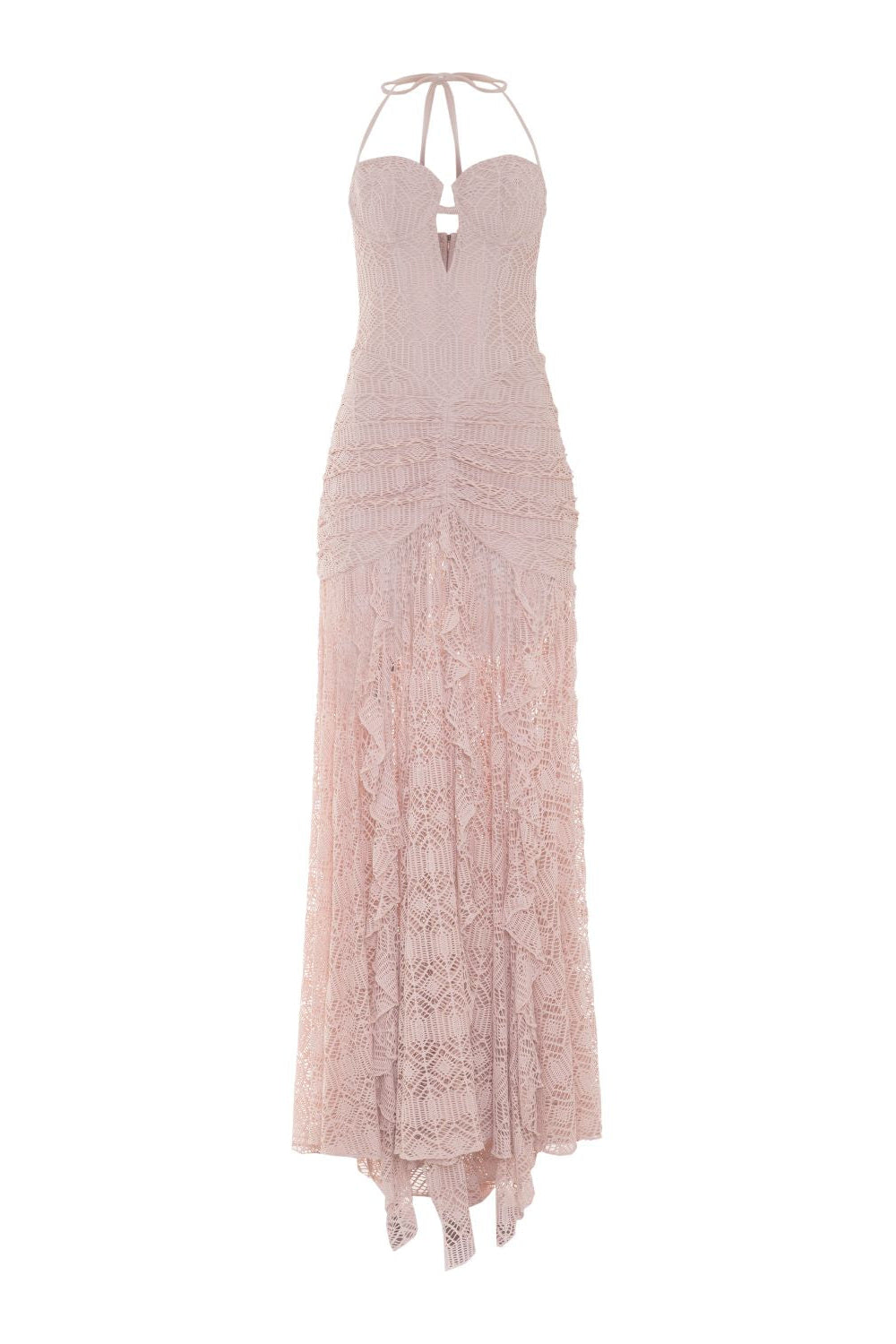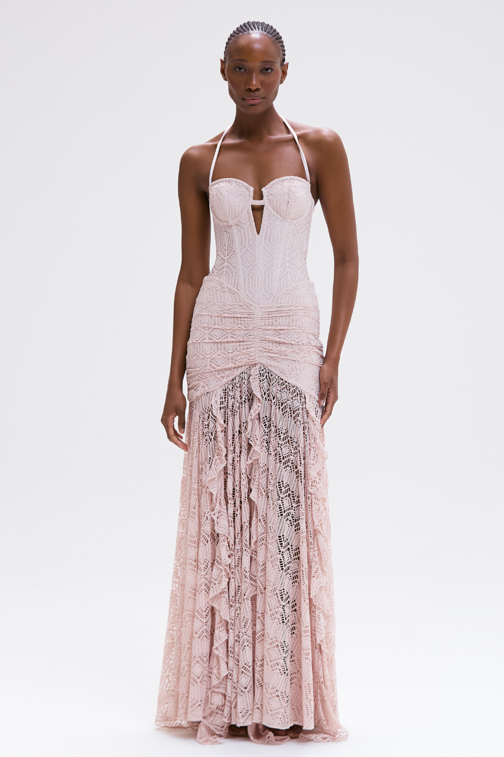 This gown features our Seashell Lycra fabric with a lined bustier style structured bodice, keyhole cut out detail and a ruching design at the hips into a sheer full length skirt with ruffled lace throughout.