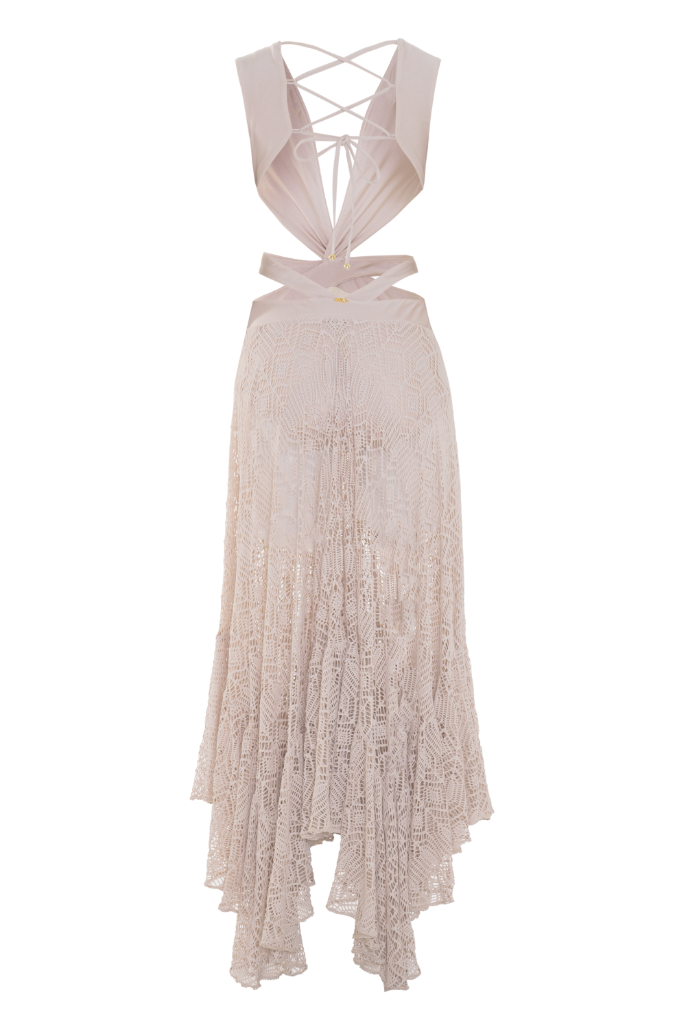 This beach dress features our Seashell Lycra fabric, with a plunging V neckline and flattering side cut out detail into an attached bodysuit with sheer fabric skirt overlay, open back design with a lace tie closure at the top.