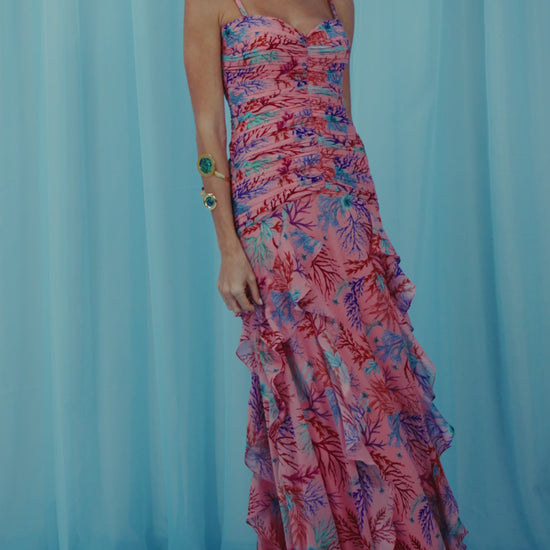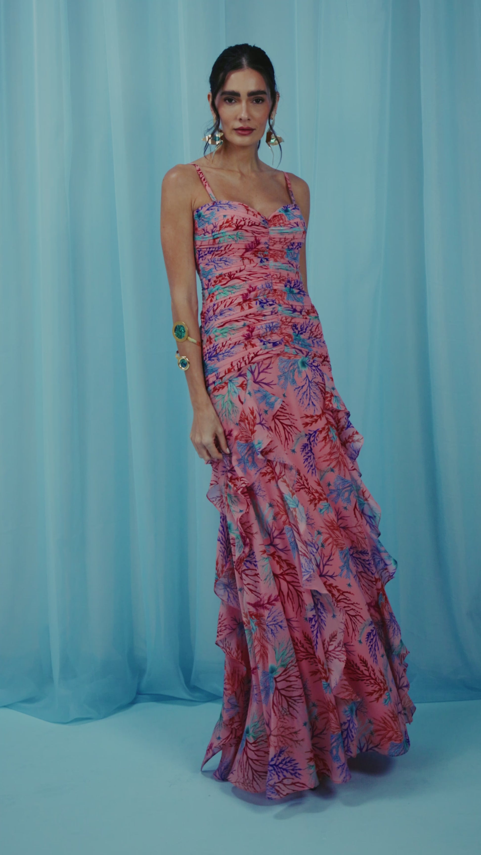 The long mousseline dress is a perfect choice for summer celebrations on warm days. Featuring an exclusive hand-drawn print, it has a draped bodice and a flowing skirt with vertical ruffles. Finished with an invisible back zipper.