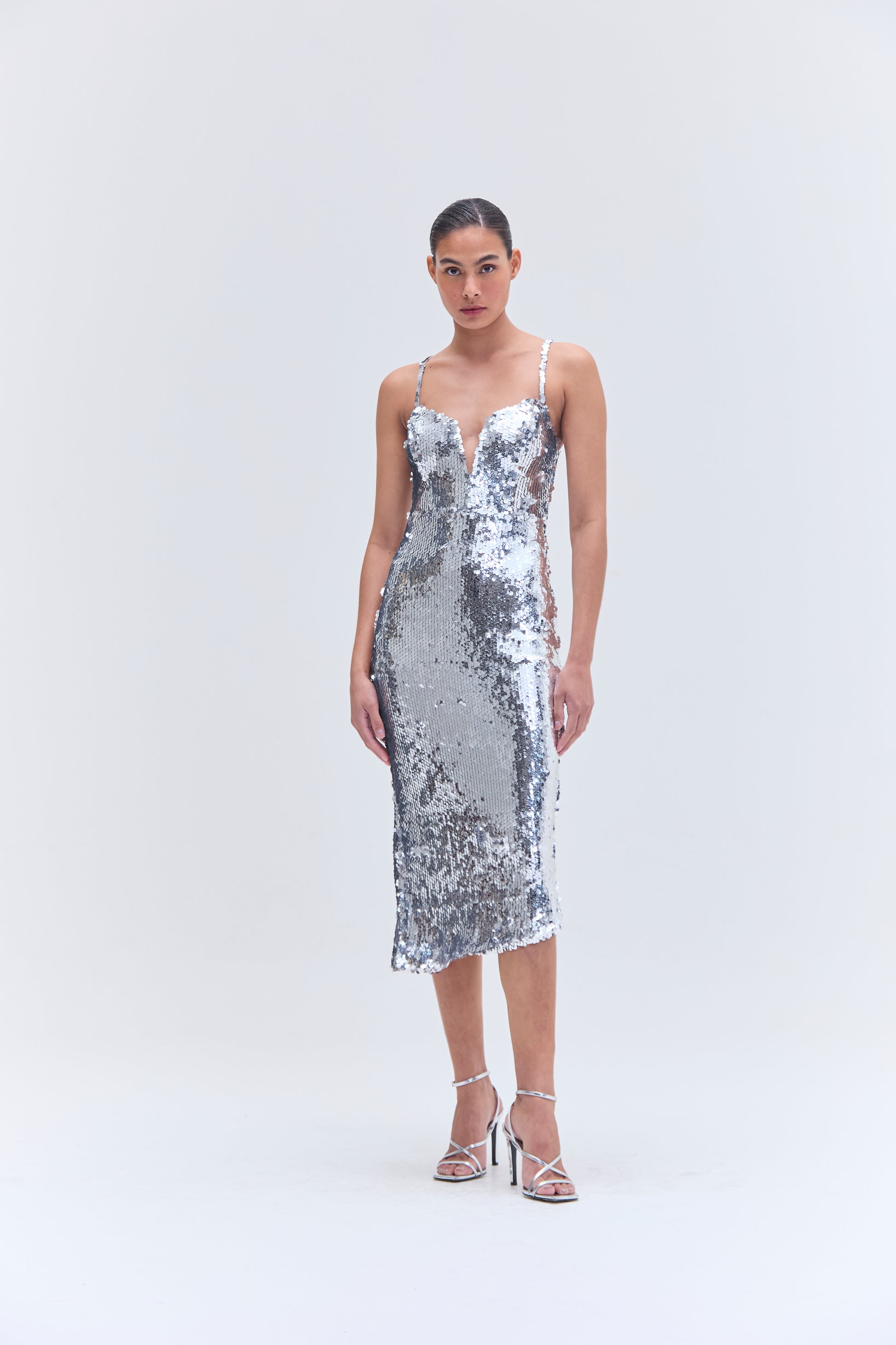 Midi dress crafted in sequins, featuring internal boning for structure and a V-shaped underwire at the neckline. Designed with thin adjustable straps, a back slit at the hem, an invisible center-back zipper, and a full inner lining.