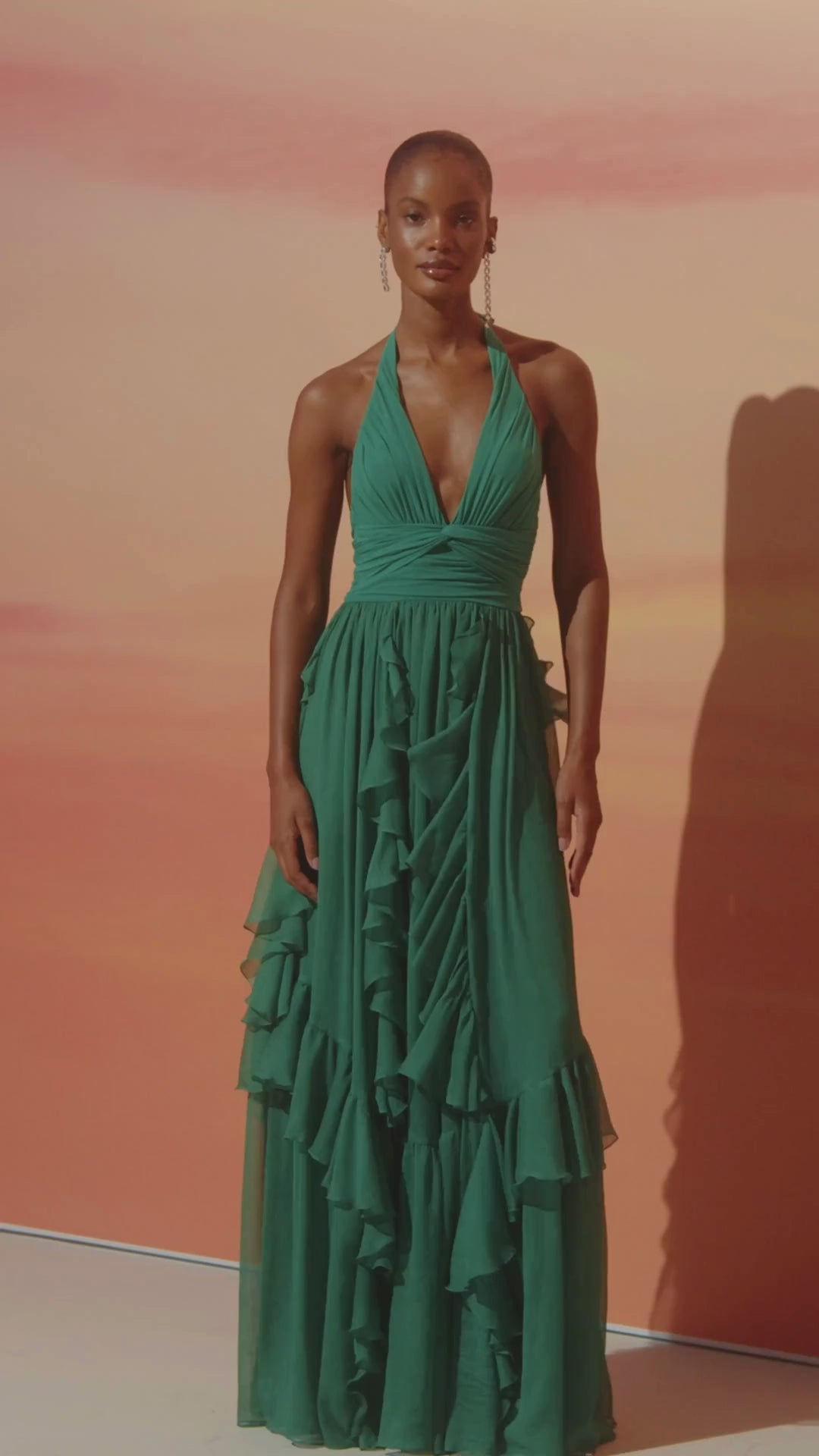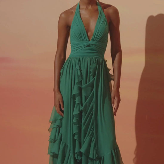 Effortlessly elegant, this green halter gown is a celebration of movement and femininity. Crafted from a lightweight, flowy fabric, it features a plunging neckline and a flattering ruched waist that beautifully contours the silhouette. Cascading ruffles add a playful touch and graceful fluidity as you walk. The open back, tied delicately at the neck, enhances its sultry, summer vibe — perfect for a sunset cocktail in Rio or an alfresco soirée by the sea.