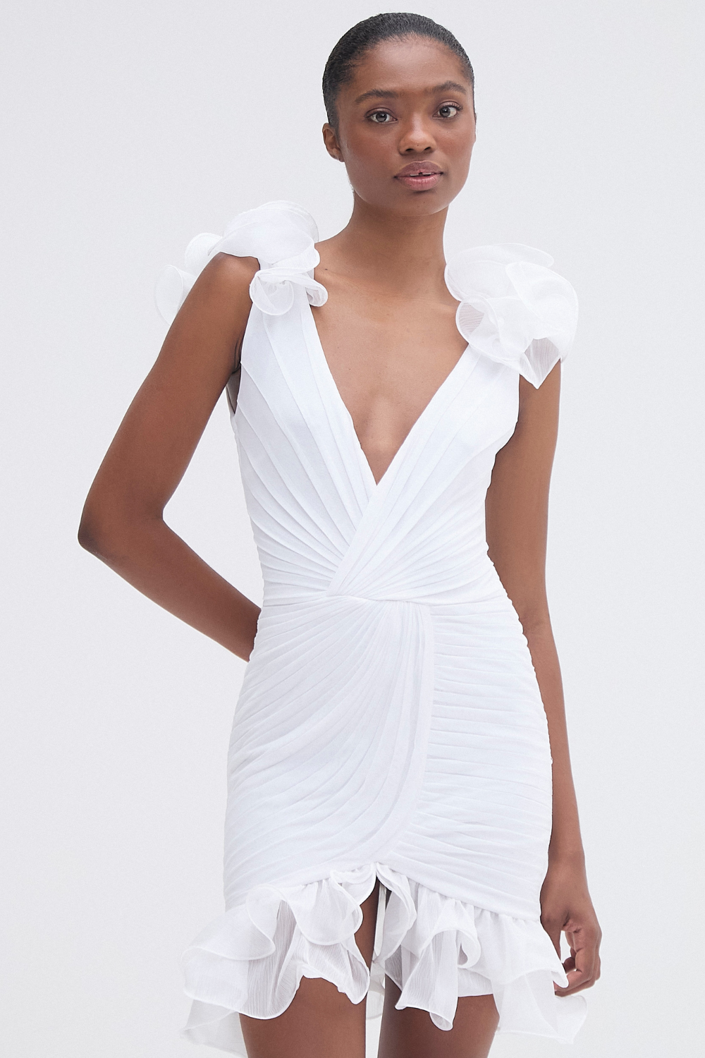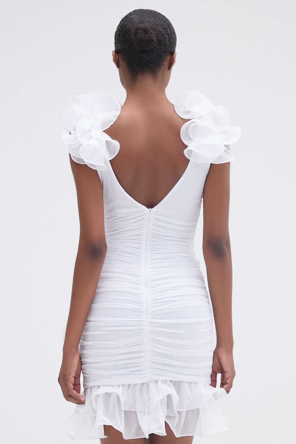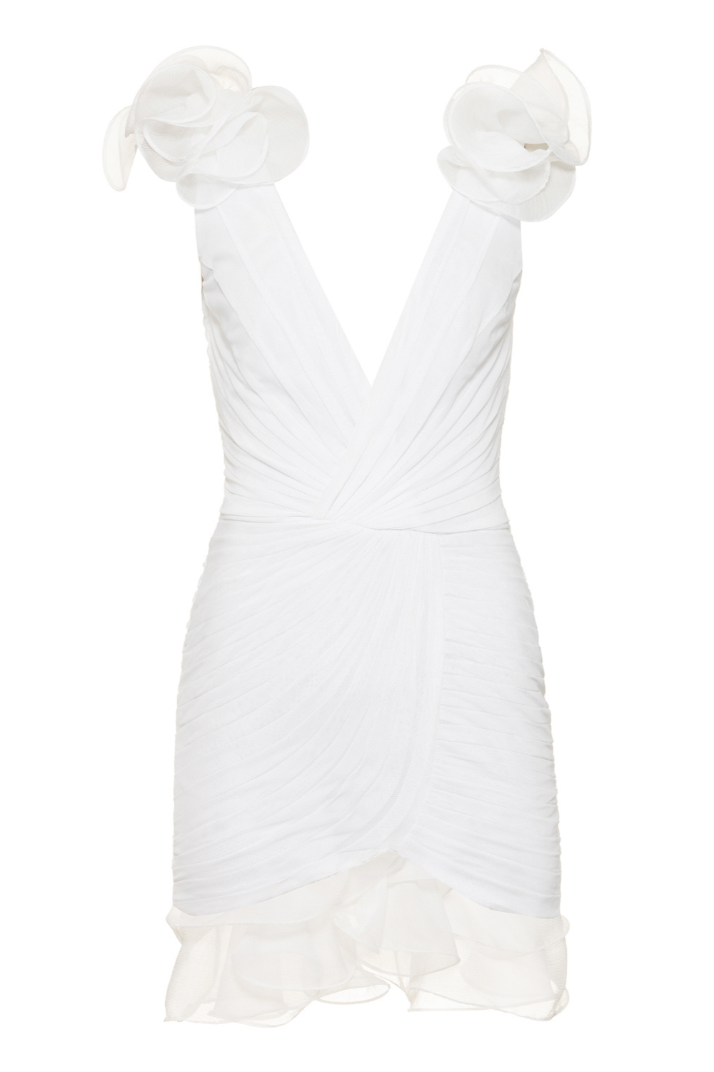 This mini dress composed of chiffon and tulle features a plunging V neckline with a flutter detail along the straps, ruching detail throughout and additional flutter along the hemline. Back zipper closure.