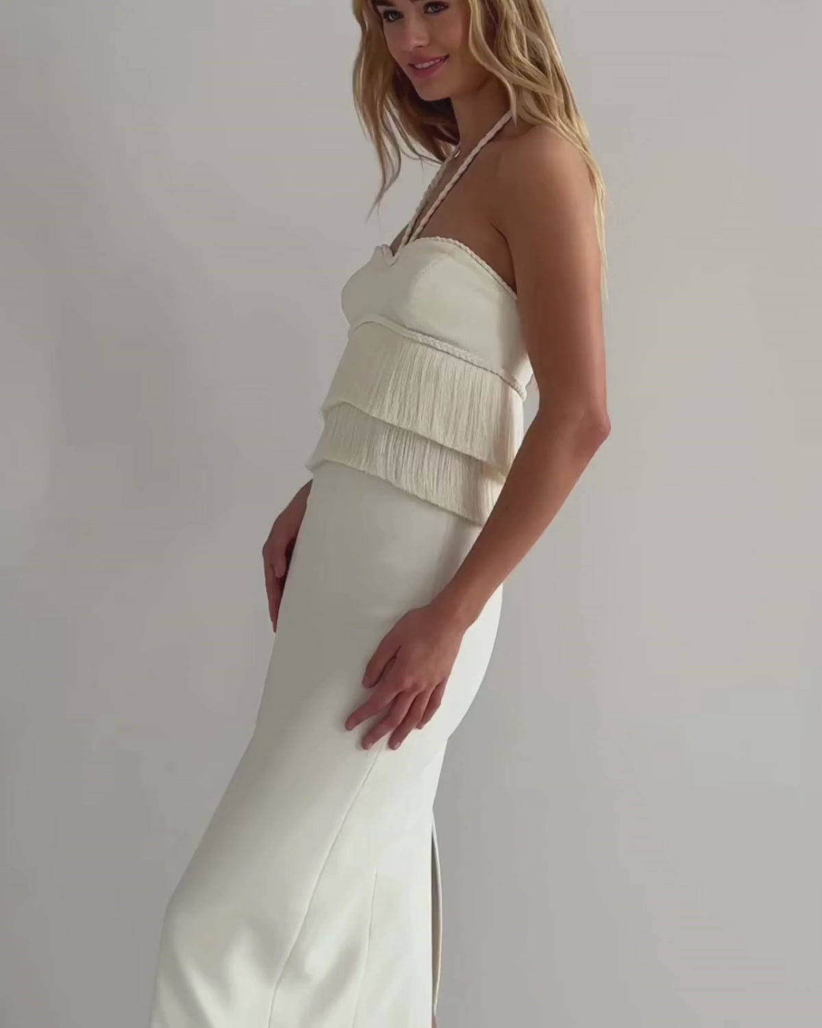 Fitted midi skirt with fringe trim is made from a medium-weight textured fabric. Concealed back zipper closure. Runs true to size.