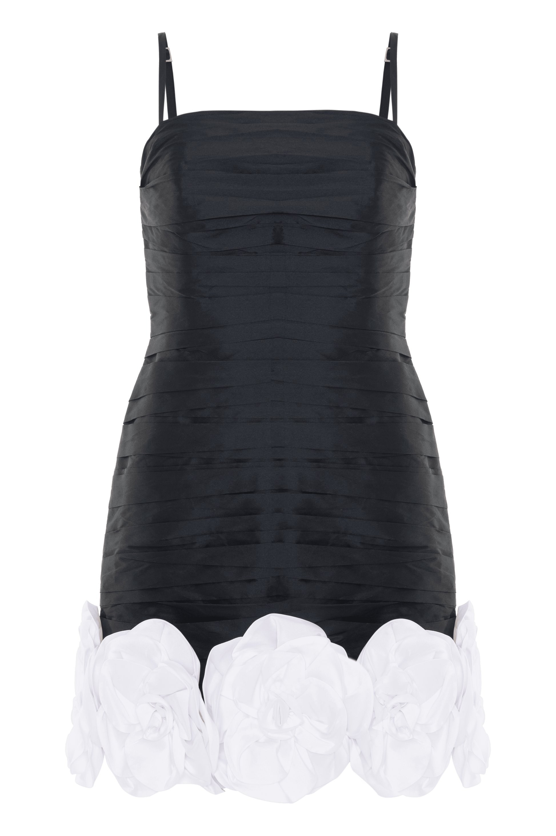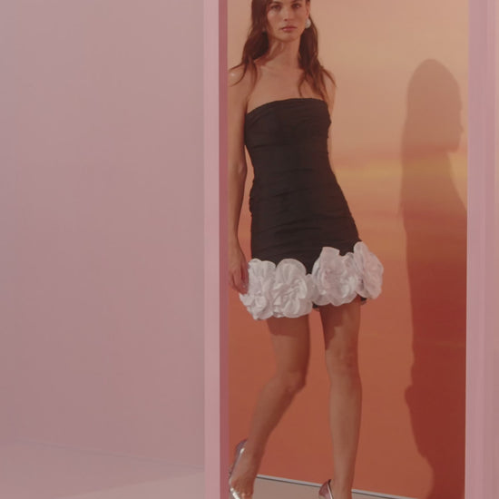 A bold celebration of texture and color, this vibrant mini dress is crafted from lustrous taffeta with a ruched bodice and dramatic floral appliqués at the hem. Detachable adjustable straps and a concealed back zipper closure ensure a customizable fit.