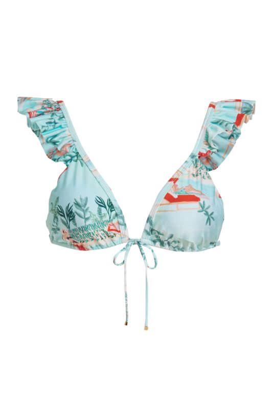 One of our best-selling bikini top shapes. Ruffles at the shoulders add femininity to this classic top shape. Top includes removable pads and adjustable sliding cups for custom fit. Adjustable back tie closure. Runs true to size. Model is wearing a size small.