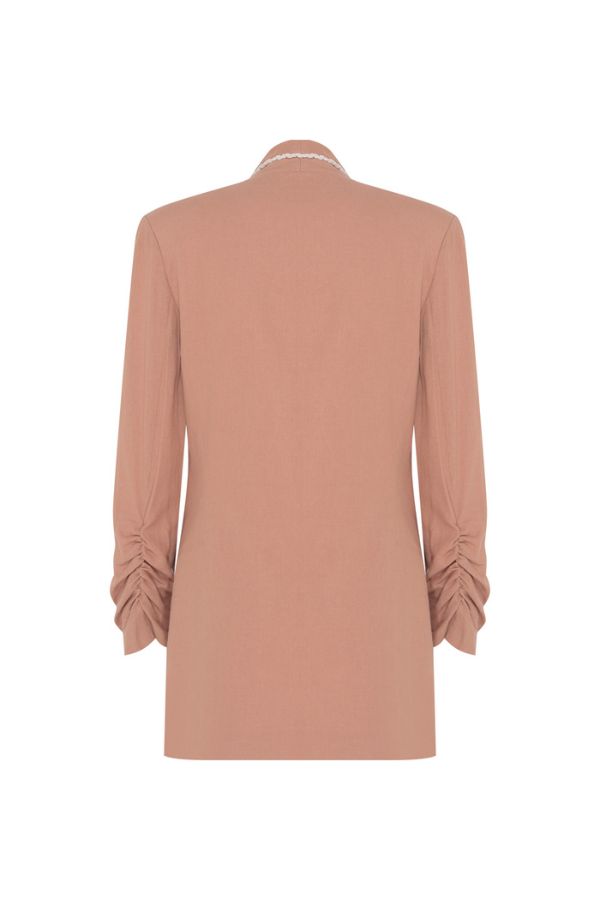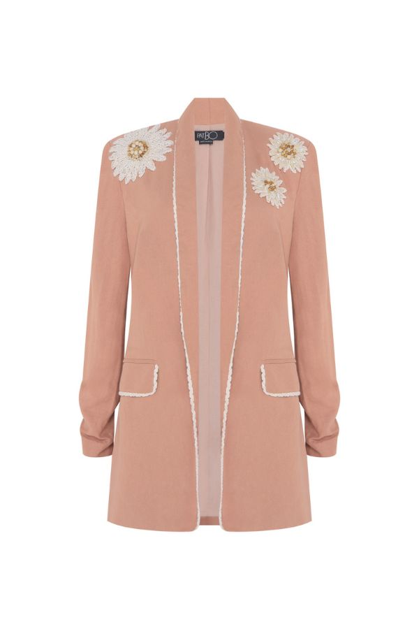 Elevated and playful, this tailored blazer features tonal crochet daisy appliqués at the shoulders for a statement finish. Crafted in a soft blush hue with subtle texture, it’s designed with sharp lapels, front pockets, and a relaxed fit. Pair it with matching shorts or pants or layer over dresses for a fresh take on polished layering.