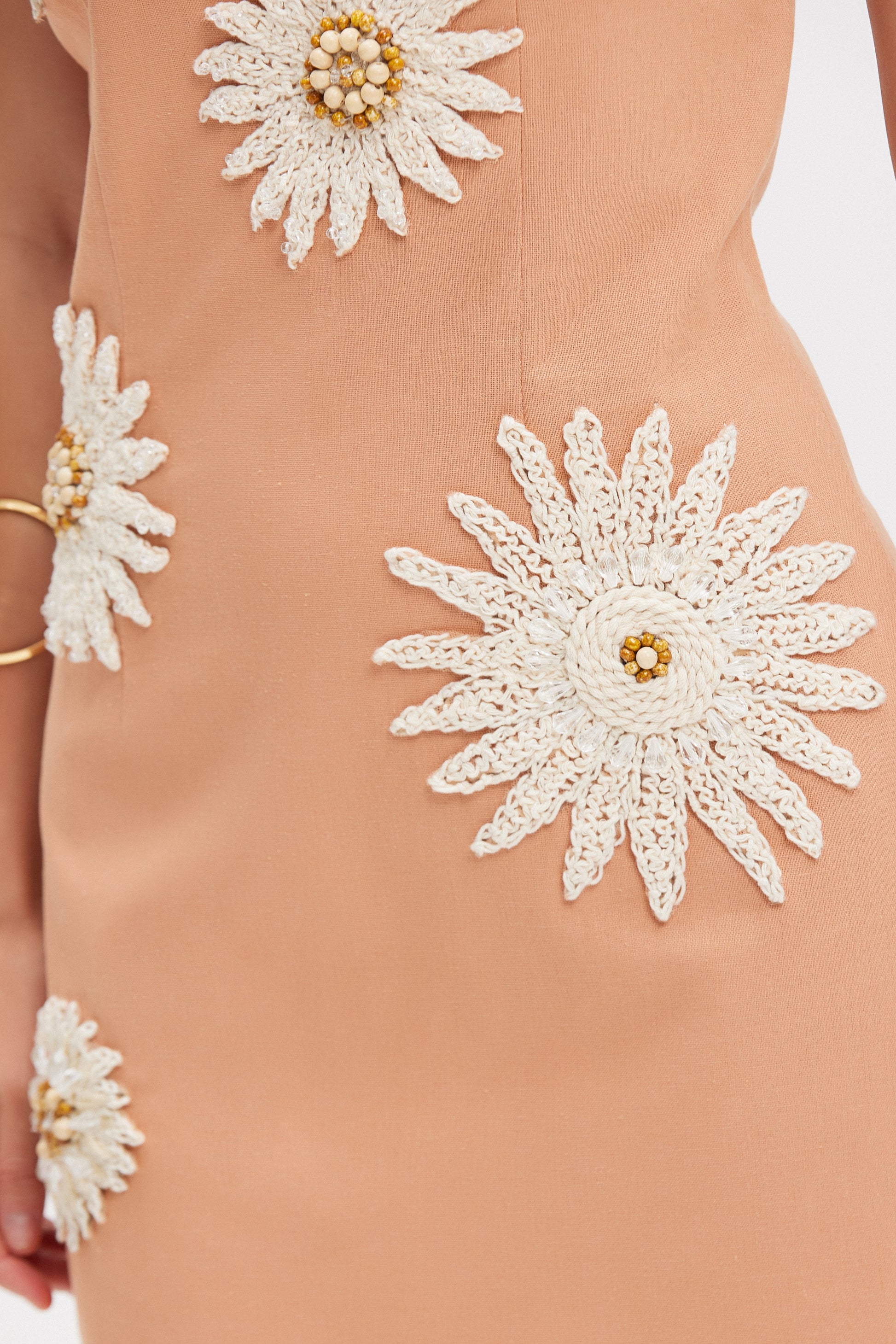 Sweet yet striking, this one-shoulder mini dress features oversized crochet daisy appliqués with beaded centers for a playful, handcrafted touch. Designed in a soft neutral hue with a clean, tailored silhouette, it’s perfect for warm-weather events or adding a dose of charm to your day-to-night wardrobe.