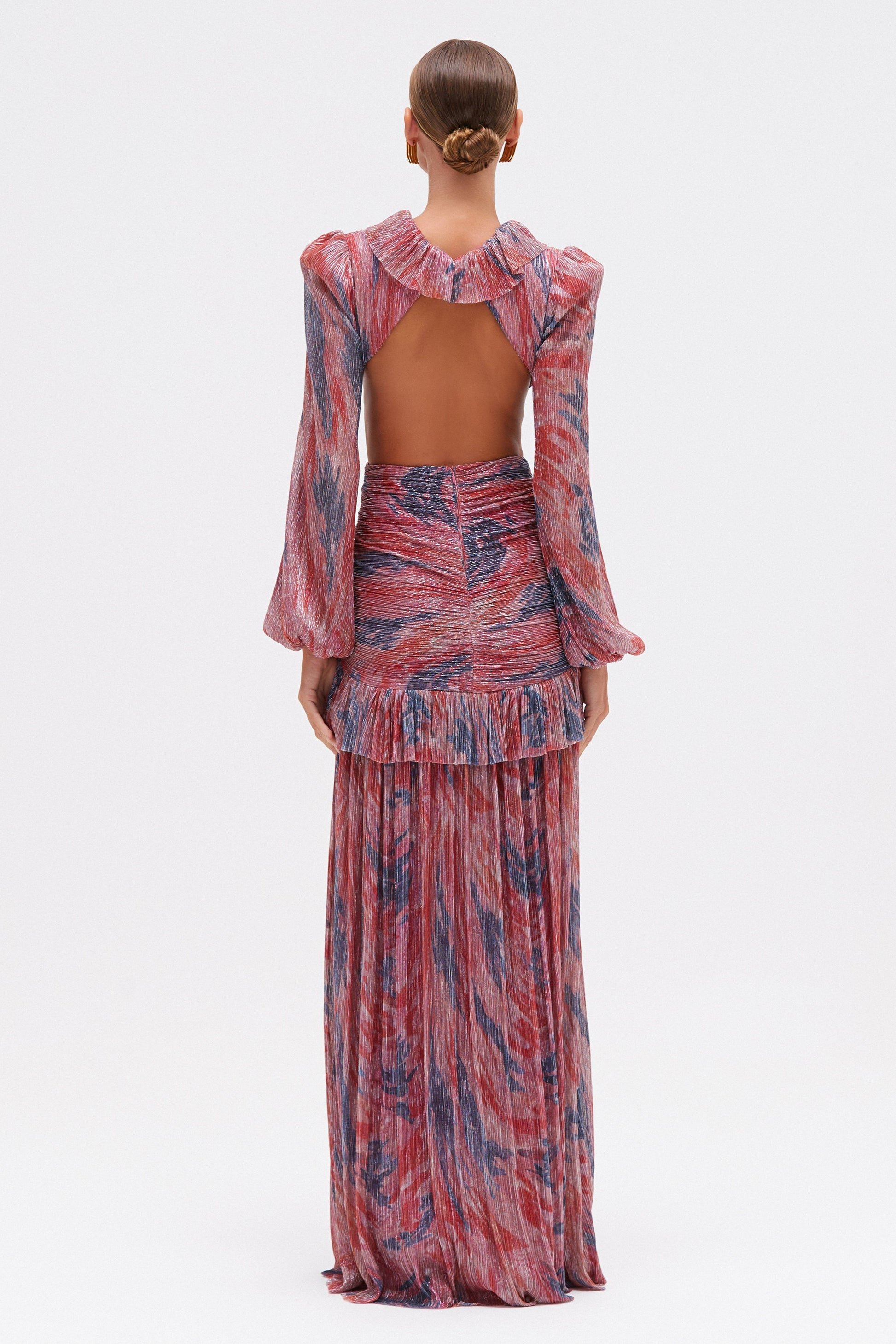 Designed in our signature Twist print—shades of pink and blue with a beautiful metallic sheen—the Twist Gown was made to turn heads. It features flowy long sleeves, a plunging ruffled neckline, and cut-outs at the waist. The open back adds a touch of drama, finished with a concealed back zipper closure.