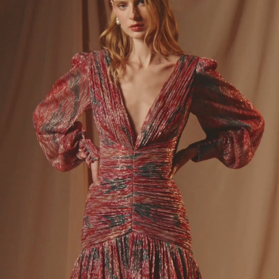 Designed in luminous stretch mesh with a metallic sheen, the Twist Mini Dress features a ruched waistline, voluminous long sleeves, and a flounced hem for added movement. Shoulder pads create a structured silhouette, while a keyhole back, concealed zipper and button-and-loop closures complete the look.